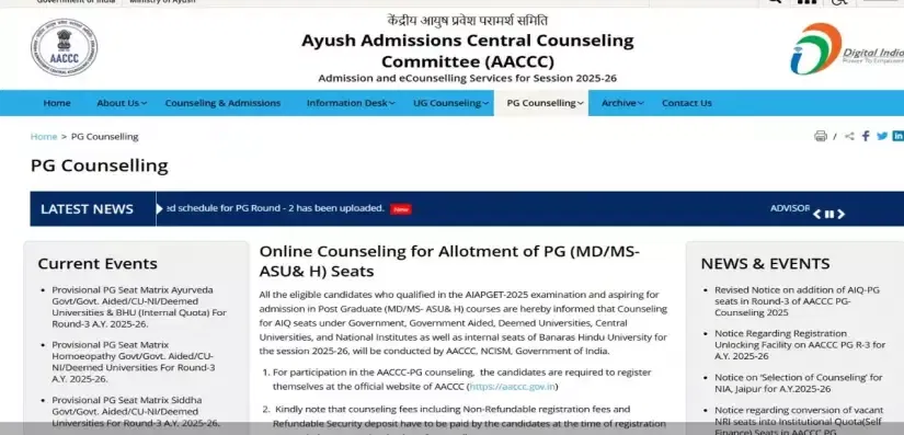 AIAPGET Round 3 Seat Allotment 2025: AYUSH Admissions Central Counselling Committee will release the allotment result for postgraduate programs today, November 6, 2025. The committee hasn’t offered any update regarding the release time for the allotment result. Per past trends, students can expect it to be uploaded by 6 PM. For any delays due to administrative or technical issues, the allotment result can eb made available by 9 PM.