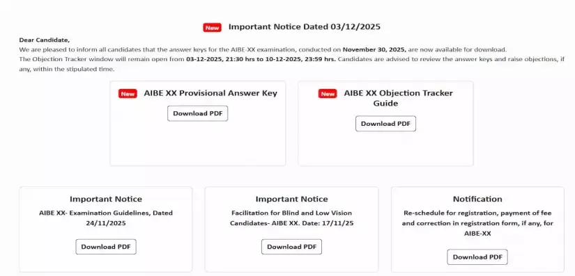 AIBE 20 Answer Key 2025: The Bar Council of India (BCI) has released the AIBE 20 provisional answer key 2025. Candidates can download the set-wise AIBE XX answer key (Set A, Set B, Set C, and Set D) from the official website- allindiabarexamination.com. BCI has also activated the AIBE 20 Answer Key 2025 objection window. Interested candidates can raise objections against the AIBE XX 2025 Answer Key till December 10, 2025. Candidates can access the direct PDF link available here.