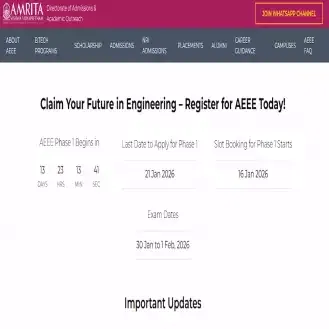 AEEE Phase 1 Slot Booking 2026: Amrita Vishwa Vidyapeetham has commenced the slot booking process for the Amrita Entrance Examination – Engineering (AEEE) 2026 today, January 16, 2026. AEEE Phase 1 slot booking is the process by which candidates who have registered for the AEEE 2026 select their preferred exam date, time, and test centre. This process is mandatory to download the AEEE 2026 admit card and appear for the examination. The AEEE Phase 1 Examination 2026 is scheduled to be held from January 30 to February 1, 2026. Also, the AEEE Phase 1 Admit Card 2026 will be available for downloading from January 25, 2026.