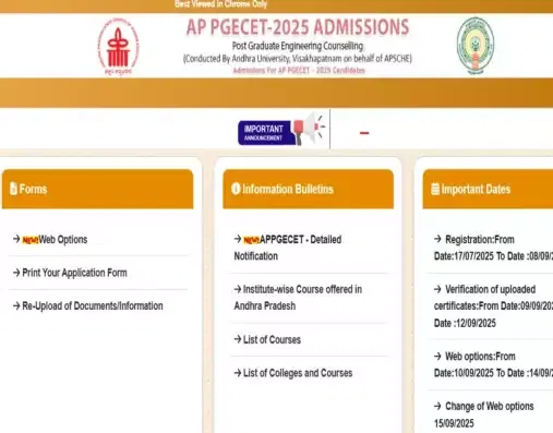 AP PGECET Web Options 2025: Eligible candidates who have registered and verified certificates can begin filling out college options on the online portal. The Andhra Pradesh State Council of Higher Education started the web option entry today, September 10, 2025. Candidates can provide their hall ticket number and date of birth to log in and select their college preferences. Candidates should arrange their web options in proper order when choosing them. Seats will be allotted based on the choices filled, entrance rank, reservation criteria, and seat matrix. After selecting an option, candidates must save and freeze it to be considered for allotment. This page provides the direct link to AP PGECET web options 2025.