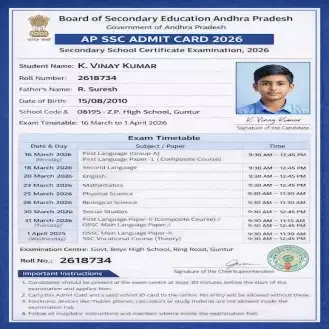 The important instructions that every student must follow, along with the detailed timetable, have been shared below. The respective schools will download the AP SSC 2206 admit card from the official website, bse.ap.gov.in. They must use their unique school code, password, student's name, and their date of birth to download the admit card. However, private school students can download it online from the website. We have provided AP SSC 2026 hall ticket direct link and important instructions on this page.