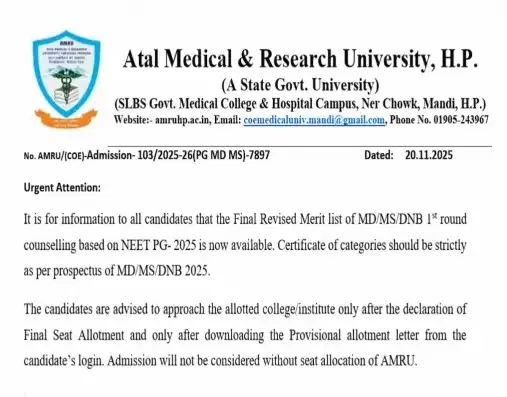 Candidates are advised to visit the official website of AMRU HP for more updates on HP NEET PG Counselling 2025 and more.