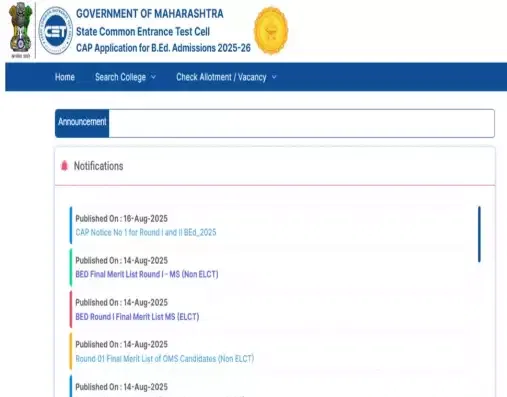 MAH B.Ed Round 1 Allotment 2025: The Maharashtra State Common Entrance Test Cell has published the seat allotment for B.Ed admission today, August 21, 2025. Candidates who have submitted the web option form by August 18, 2025, are only eligible for the Round 1 seat allocation. To check allotment status, candidates can log in with their registered ID at the online portal. Those who are offered a seat per their first preference, their seat will be automatically freezed.