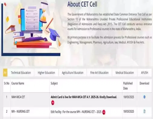 MAH MCA CET Admit Card 2025 Download Link: The Maharashtra State Common Entrance Test Cell has released the admit card for the Maharashtra Masters of Computer Application Common Entrance Test (MAH MCA CET) 2025. Registered candidates can download the MAH MCA CET 2025 admit card from the official website- cetcell.mahacet.org. The MAH MCA CET 2025 is scheduled to be held on March 23, 2025. Candidates can access the MAH MCA CET Admit Card 2025 Download Link available here.