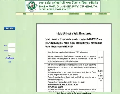 Punjab NEET PG Counselling 2025: The Baba Farid University of Health Sciences (BFUHS), Faridkot, has released the Round 3 Counselling schedule. As scheduled, the Punjab NEET PG Counselling 2025 Round 3 Registration process has started today, January 3, 2026. Eligible candidates can visit the official website - bfuhs.ggsmch.org to complete the Punjab NEET PG Counselling 2025 Registration for Round 3.