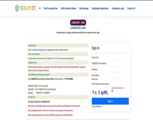 - Enter Login ID, TG EAMCET Hall Ticket No., password, date of birth, and captcha.
