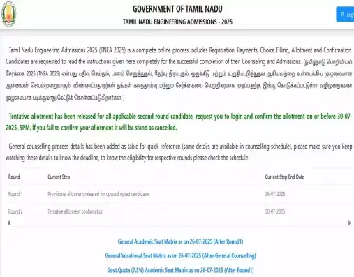 TNEA Round 2 Tentative Allotment 2025: The Tamil Nadu Government has released Tamil Nadu Engineering Admissions 2025 (TNEA 2025) Round 2 Tentative Allotment 2025. The official notification states that "Tentative allotment has been released for all applicable second round candidates, request you to log in and confirm the allotment on or before July 30, 5 PM, if you fail to confirm your allotment, it will stand as cancelled". Candidates can download the TNEA Round 2 Tentative Allotment 2025 at the official website- tneaonline.org. Get the direct link available here for your reference.