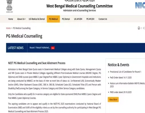WB NEET PG Round 1 Seat Allotment Result 2025: The West Bengal Medical Counselling Committee has declared the seat allotment result for National Eligibility cum Entrance Test PG today, November 27, 2025. The seat allotment list was prepared only for the candidates who have been included in the list of verified candidates. Candidates can download the allotment list from the portal of WBMCC.