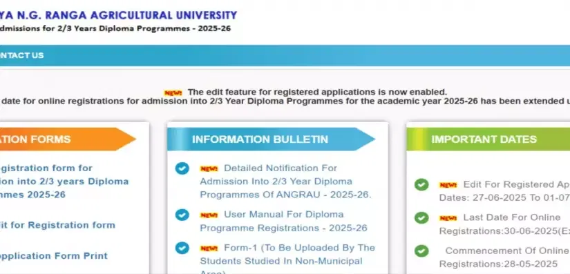 ANGRAU Diploma Counselling 2025: Acharya NG Ranga Agricultural University, Guntur, will soon close the registration window for Diploma in Agriculture programmes. Candidates interested in enrolling in diploma courses must complete the registration process by today, June 30, 2025. Those who have already registered can edit their application forms till July 1, 2025. The application form is available at the official website of ANGRAU.