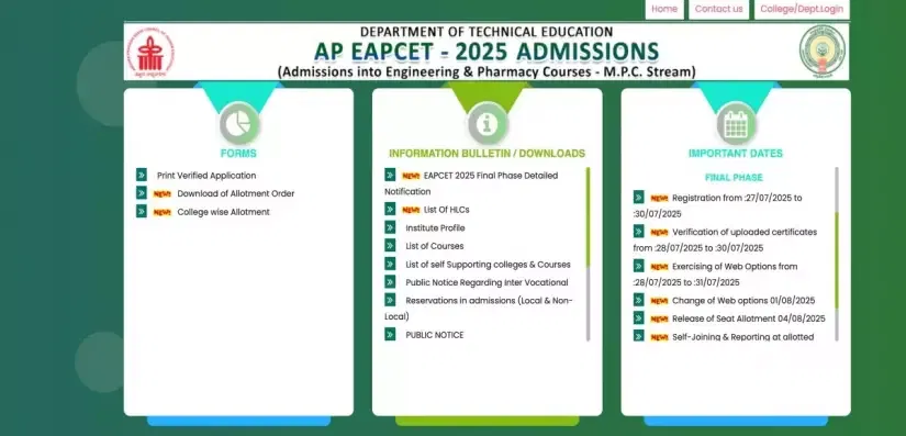AP EAMCET Final Phase Counselling Dates 2025: The Department of Technical Education, Andhra Pradesh, has released the AP EAMCET Final Phase Counselling Dates 2025. While the AP EAMCET First Phase Counselling is scheduled to conclude on July 26, 2025, with the last day of self-reporting and college joining, the authorities have released the final phase counselling dates.