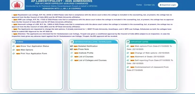 AP LAWCET 2025 Web Option Editing: Andhra Pradesh State Council of Higher Education (APSCHE) commenced the web options entry process for AP LAWCET 2025 on October 22, 2025. According to the official schedule, the AP LAWCET 2025 Web Option Editing Process will close today, October 23, 2025.