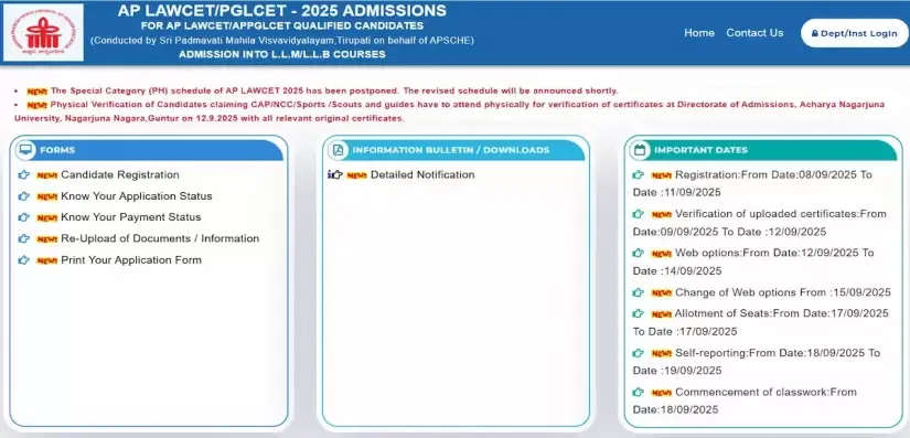 AP LAWCET Web Options Last Date 2025: Sri Padmavati Mahila Visvavidyalayam, Tirupati, on behalf of APSCHE, will close the web option entry window of AP LAWCET Phase 1 Counselling 2025 today, September 14, 2025. Registered candidates can fill in their choices at the official website- lawcet-sche.aptonline.in/LAWCET. As the AP LAWCET Web Options Last Date 2025 is scheduled, all the candidates who wish to edit their web options can do so by September 15, 2025. Based on the choices filled by the candidates, the AP LAWCET Phase 1 Seat Allotment 2025 will be released on September 17, 2025. Access the direct link available here for reference.