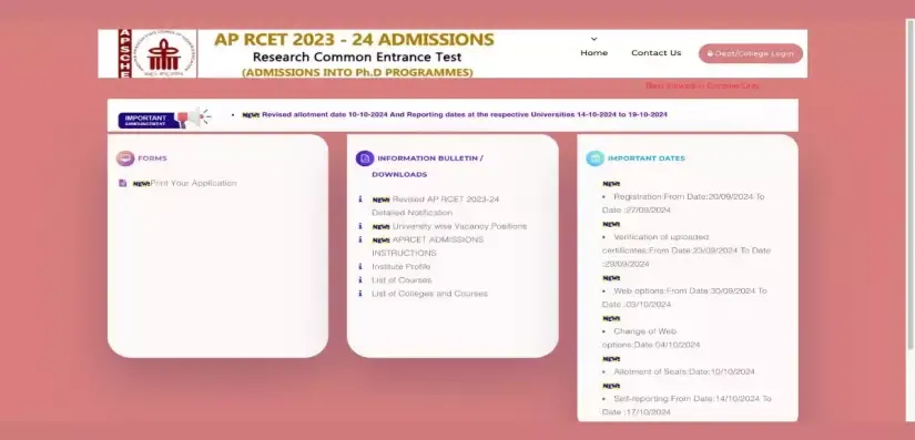 AP RCET First Phase Seat Allotment 2024 (Today): The Andhra Pradesh State Council of Higher Education (APSCHE), Guntur, has released the first phase seat allotment results of Andhra Pradesh Research Common Entrance Test (AP RCET) 2024 today, October 10, 2024, on the official website- rcet-sche.aptonline.in. As per the revised schedule, the self-reporting is scheduled from October 14 to 19, 2024.