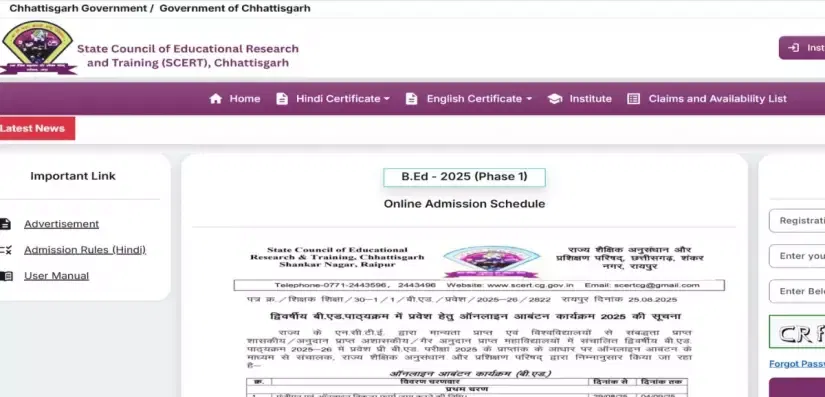 CG BEd Round 1 Registration 2025: The State Council of Educational Research and Training, Chhattisgarh, started the pre-B.Ed counselling registration for Round 1 from August 29 onwards. Candidates who have secured the required qualifying cutoff in the entrance exam can only participate in the counselling process. Before registration, we suggest students open the complete registration process on a Chrome 22/Firefox browser only, and no phones should be used for completing the counselling registration and choice filling. Find the direct link and essential CG B.Ed Round 1 registration 2025 instructions here.