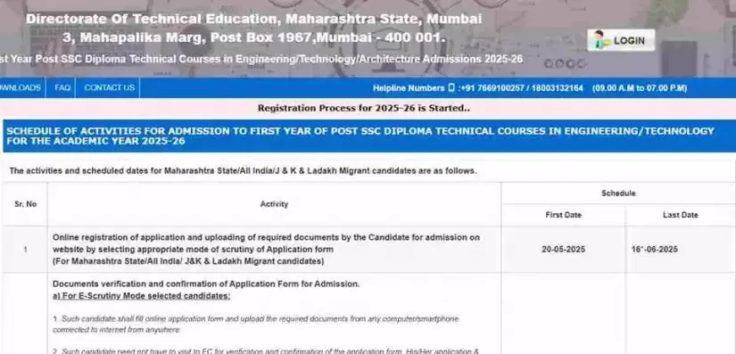 | Commencement of DTE Maharashtra Polytechnic Registration | May 20, 2025 |