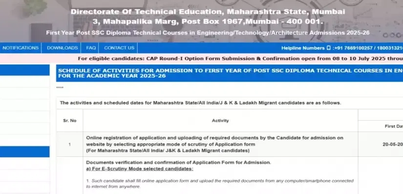 DTE Maharashtra Polytechnic CAP Round 1 Option Form 2025: The Directorate of Technical Education, Maharashtra Polytechnic web options entry will be closing today, July 10, 2025. Registered candidates can log in with their credentials to select course and college preferences for seat allotment. As the seats will be allocated based on the choices filled by the candidates, it is suggested to select the institutes carefully.