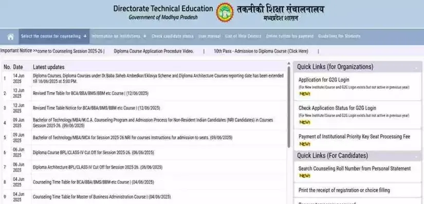 Visit the official website of the Directorate of Technical Education (DTE), Madhya Pradesh, for more updates on DTE MP B.Tech Counselling Registration 2025 and more.