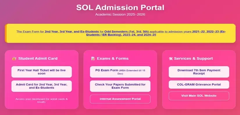 DU SOL 2025 Admit Card: Delhi University (DU) has released the admit cards for the December/January odd semester DU SOL exams 2025 for 2nd and 3rd year (3rd, 5th, and 7th semester) students, as well as ex-students. The DU SOL admit cards for 1st-year (1st-semester) students will be released soon. Students can download the DU SOL 2025 Admit Card from the official website- sol.du.ac.in.