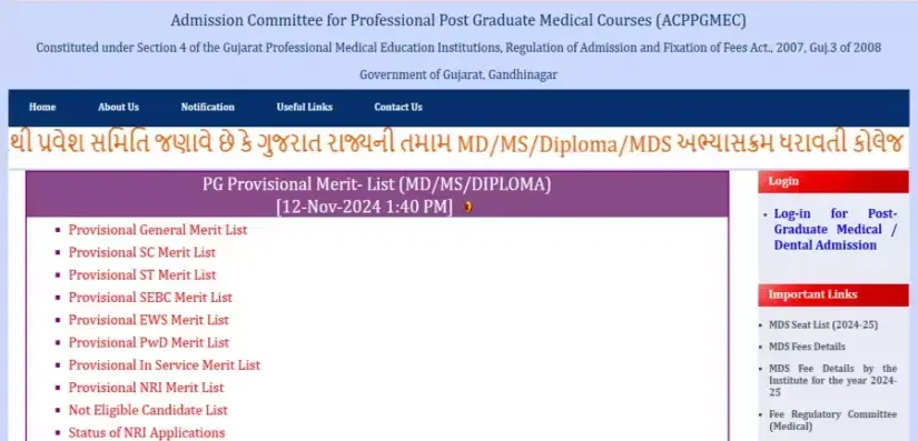 If any candidate has any issues regarding the Provisional Merit List of ACPPGMEC-2024, they must submit legible scanned copies of supportive documents via e-mail to medadmgujarat2018@gmail.com on or before 1 PM, November 14, 2024. Candidates must mention their user ID and name to communicate with ACPPGMEC and submit grievances.