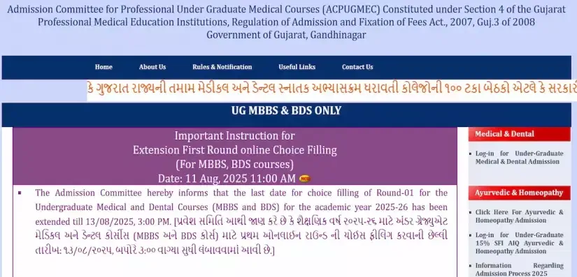 Gujarat NEET UG Round 1 Allotment 2025: The Admission Committee for Professional Under Graduate Medical Courses (ACPUGMEC) had extended the choice filling process for the Gujarat NEET UG Round 1 Counselling 2025 till today, August 13, 2025. As the choice filling last date was extended, candidates can expect the Gujarat NEET UG Round 1 Allotment 2025 to be released soon. The Gujarat NEET UG 2025 Round 1 Allotment will be released online at the official website- medadmgujarat.org. Interested candidates can access the Gujarat NEET UG 2025 Round 1 Seat Allotment expected release date and time here.
