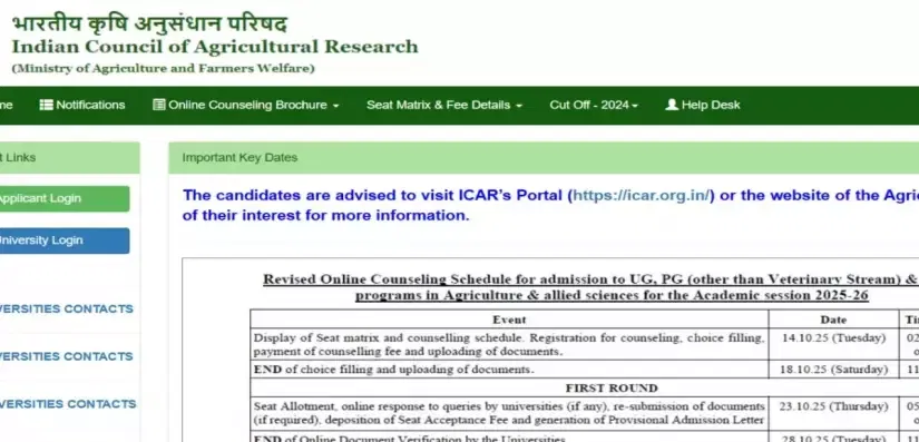 ICAR Round 4 Seat Allotment 2025: The Indian Council of Agricultural Research has released the seat allotment result for Round 4 counselling today, November 10, 2025. Registered candidates who have filled choices by the deadline are only considered for the allotment. To check seat status, aspirants should log in using their application number and password.
