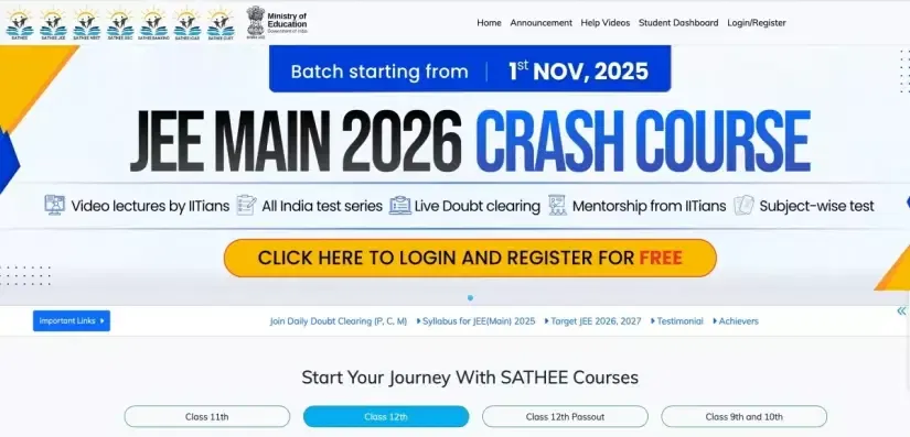 Commencing from November 1, 2025, the SATHEE crash course will provide equal preparation opportunities to the underprivileged students. The course is designed to strengthen fundamental skills and enhance overall exam preparation through a variety of educational materials. There will be live interactive classes from 3:00 P.M. to 6:00 P.M., along with live doubt-clearing sessions and more. Interested students will have to register by visiting the official website - satheejee.iitk.ac.in/crash-course-for-jee-main.