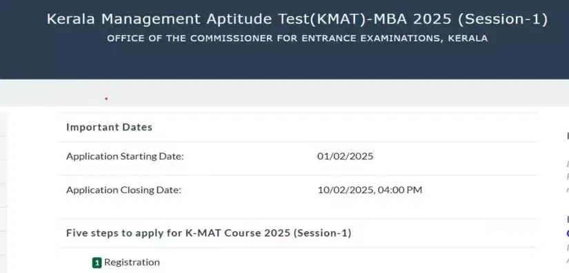 KMAT 2025 Application Form: Government of Kerala - Office of the Commissioner for Entrance Examinations, has commenced the registration process for the Kerala Management Aptitude Test(KMAT)-MBA 2025 (Session-1). Interested and eligible candidates can apply for the KMAT 2025 Registration at the official website- cee.kerala.gov.in. The direct link to fill out the KMAT 2025 Application Form is given below. Also, candidates must register for the KMAT 2025 Session 1 examination by February 10, 2025, by 4 PM. As per the official dates announced, the KMAT 2025 Examination will be held on February 23, 2025.