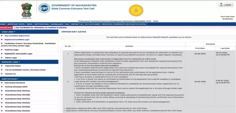 MAH MBA CAP Registration Last Date: The State Common Entrance Test Cell, Maharashtra, is set to close the online registration of application and uploading of required documents by the Candidate for admission to MBA. According to the official schedule, the MAH MBA CAP Registration Last Date is today, July 8, 2025. Candidates must complete and submit their application form by visiting the official portal - mba2025.mahacet.org.in.