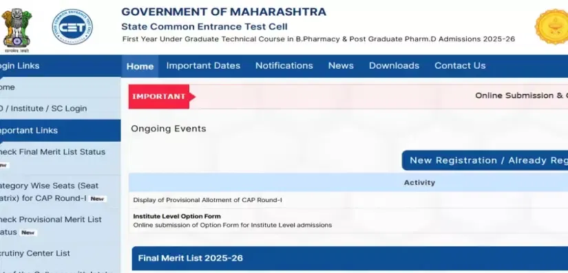Maharashtra B.Pharma Round 1 Seat Allotment 2025: The Maharashtra State Common Entrance Test Cell has uploaded the seat allotment result for Round 1 B.Pharmacy on its website today, October 3, 2025. Candidates who have filled out the option form can check their allotment status by logging in to the online portal using their registered credentials.