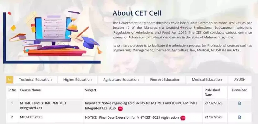 MHT CET 2025 Entrance Examination for Admission to Professional Courses in Engineering/ Technology, Pharmacy, B.Planning, M.Planning (Integrated) and Agricultural Education through State Common Entrance Test Cell, Mumbai for the academic year 2025-26 will be held at the various examination centres within and outside Maharashtra State. Candidates who have passed class 12th or HSC Examination with Physics, Chemistry, English, and Mathematics/Biotechnology/Biology/Technical Vocational subjects can apply for the MHT CET Registration 2025. Candidates are advised to visit the official website of the State Common Entrance Test Cell, Maharashtra, for more information on MHT CET 2025.