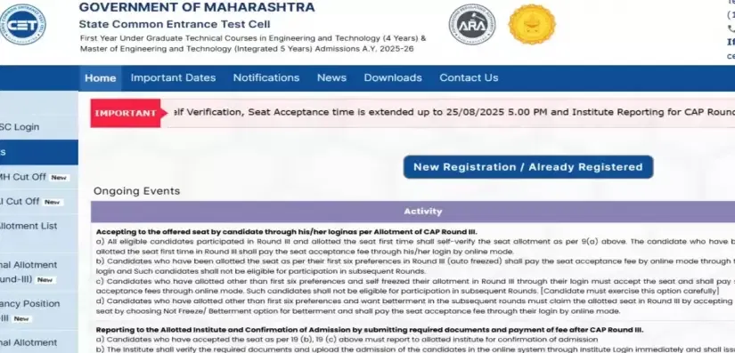 MHT CET Round 4 Vacant Seat 2025: The Maharashtra State Common Entrance Test Cell updated the schedule for the Round 4 vacant seat. Per the schedule, the vacant seats PDF will be published on August 26, 2025. Candidates who opted for betterment in Round 3 can check the institute-wise and category-wise seats. The official hasn’t notified regarding the release time of the seat matrix; however, based on past trends, students can expect it to be out after 5 PM. In case of any delay due to unavoidable circumstances, the seat details will be updated by 9 PM.