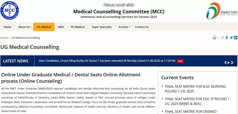 The latest notification on the MCC's official website states that “Dear Candidates, Choice filling facility for Round 1 has been extended till Monday Dated (11.08.2025) at 11:59 PM.” The Round 1 of NEET UG Counselling provides a "Free Exit" option, allowing candidates to decline an allotted seat without losing their security deposit. However, for Round 2 and subsequent rounds, exiting from the counselling process will result in the loss of the security deposit. Likewise, candidates accepting a seat in the third round will not be eligible to resign or upgrade and will not be permitted to participate in further rounds.