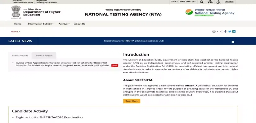 NTA SHRESHTA Exam 2026 Application Form: The National Testing Agency (NTA) is set to close the application form-filling process for the Scheme for Residential Education for Students in High Schools in Targeted Areas (SHRESHTA) 2026. According to the official schedule, the NTA SHRESHTA Exam 2026 Application Form window will close today, October 30, 2025. Students are instructed to complete and submit the form by 5:00 P.M. by visiting the official website - exams.nta.nic.in/shreshta/.