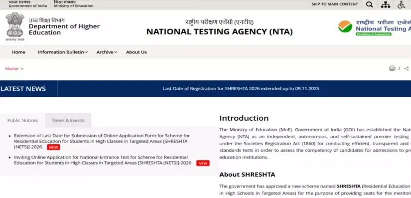 NTA SHRESHTA Exam 2026 Application Form: The National Testing Agency has extended the deadline for the SHRESHTA exam application form. According to the revised schedule, the registration window will remain open until November 9, 2025, as it was previously scheduled to close on October 30, 2025. Aspirants should carefully read the eligibility conditions and admission policy outlined in the information brochure before applying.