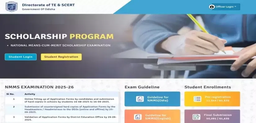 Odisha NMMS Exam Registration 2025: The Directorate of TE and SCERT, Government of Odisha, started registration for Odisha NMMS Exam 2025 on August 16, 2025. According to the official notification, the Odisha NMMS Exam Registration 2025 closes today, September 16, 2025. Interested and eligible candidates must complete the registration for the National Means-cum-Merit Scholarship (NMMS) before the due date expires.