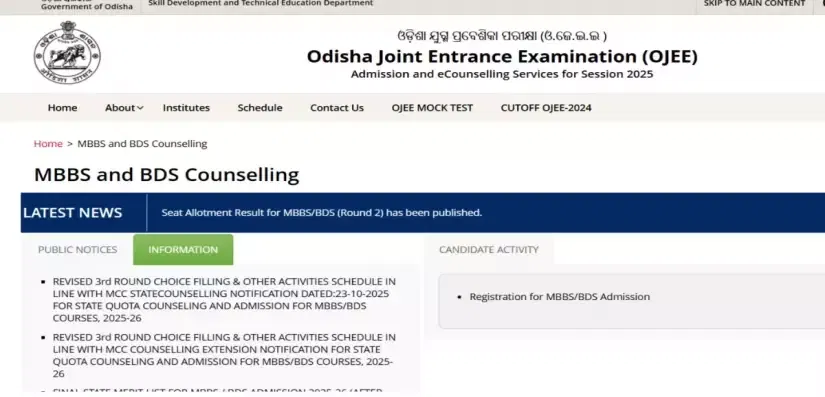 OJEE NEET UG Round 3 Seat Allotment 2025: The Skill Development and Technical Education department, Odisha, has released the seat allotment result for Round 3 MBBS/BDS programmes today, October 29, 2025. Registered candidates can click on the allotment list link available on the website of the OJEE and chcek their seat status. It will be provisional, hence the allocated seat is not confirmed.