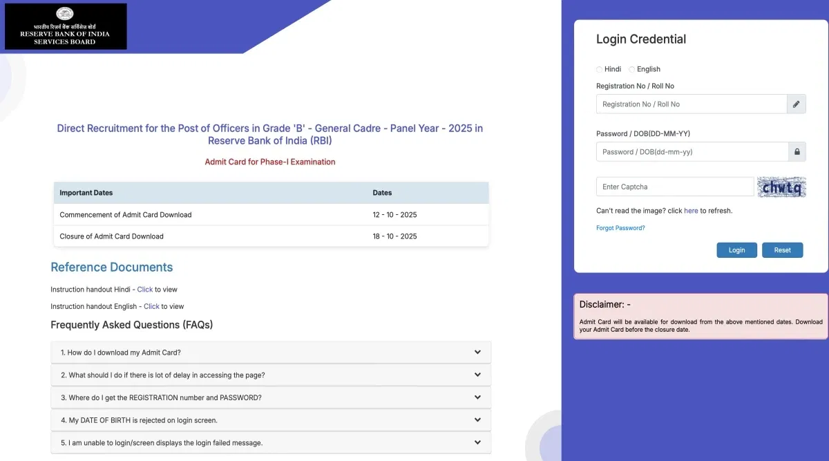 Details Available on RBI Grade B Phase 1 Admit Card 2025