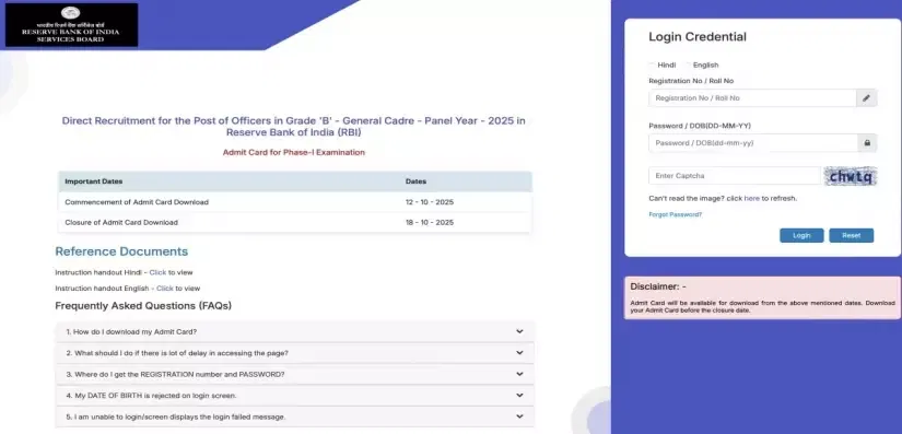 The RBI Grade B Phase 1 Exam 2025 for general posts is scheduled for October 18, 2025, and for DEPR/DSM posts, the exam is scheduled for October 19, 2025. The applicants of both streams can download the admit card using the same link provided. It is important to note that the last date to download the RBI Grade B Phase 1 Admit Card 2025 is October 18, 2025. The exam is scheduled from 2:00 PM to 4:00 PM; however, the gates will close at 1:45 PM, and the reporting time is 1:00 PM. Candidates must arrive at the exam centre before the reporting time ends.