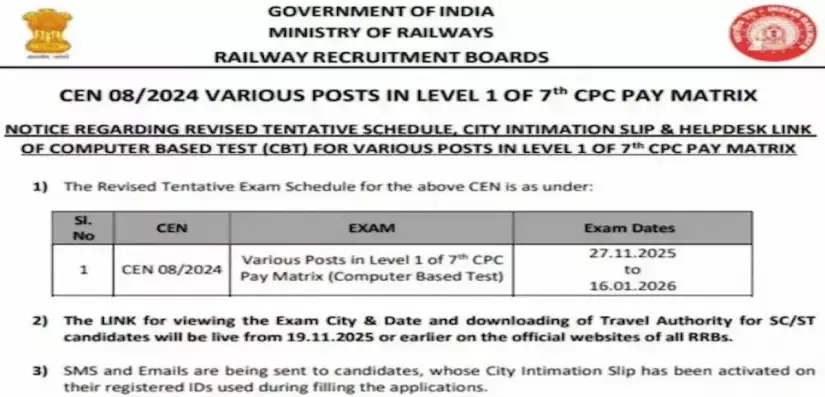 RRB Group D City Slip 2025: As per the revised schedule, the Railway Recruitment Board (RRB) has released the city intimation slip for the RRB Group D Recruitment 2025 today, November 19, 2025. The RRB Group D Recruitment CBT-1 Examination 2025 will be held from November 27, 2025, to January 16, 2026. The RRB Group D Admit Card 2025 will be released on November 23, 2025. RRB Group D City Intimation Slip 2025 is a notice released by RRB to inform candidates about their exam city, state, date, and shift timing for the examination. Candidates can download the RRB Group D City Slip 2025 from the official website- rrbcdg.gov.in. Access the direct link to download the city slip and important instructions here.