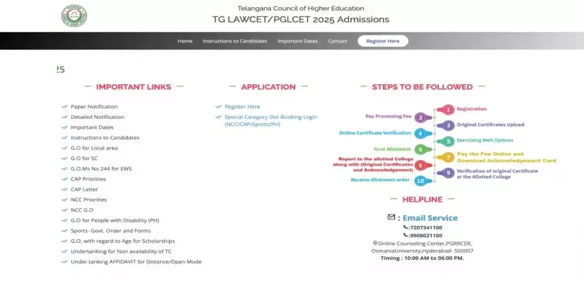 Candidates must complete the TS LAWCET Counselling Registration before the due date expires, by visiting the official website - lawcetadm.tgche.ac.in. The verified list of eligible candidates will be declared on the portal on August 20, 2025. Such candidates will be eligible to complete the web options entry and will be considered for the seat allotment process.
