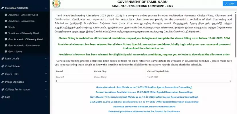 Candidates must visit the official website to access their seat allotment result of the TNEA 2025 round 1 seat allotment. The link to the official website: https://www.tneaonline.org/.