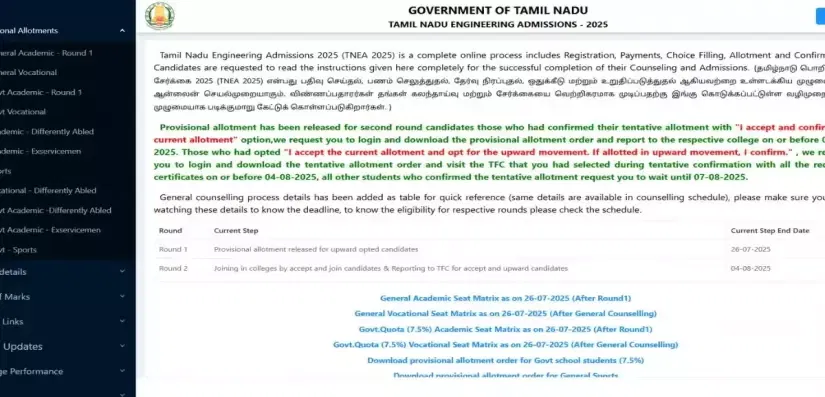 According to the schedule updated by TNEA, college reporting must be completed by August 4, 2025; otherwise, the seat will be forfeited. Candidates dissatisfied with the allotted seat and have opted for upward movement should visit the TFC centre to complete document verification; however, for provisional allotment, they have to wait till August 7, 2025. We have added a direct link to the TNEA Round 2 provisional allotment letter on this page.
