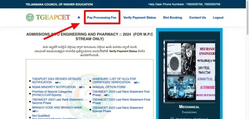 - Select the TS EAMCET Processing Fees Payment Link 2024, available on the home page.