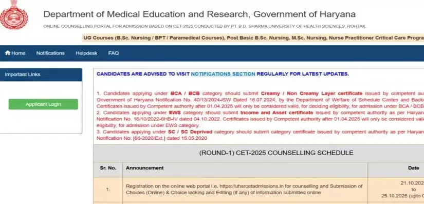 UHSR CET Seat Allotment 2025 Round 1: The Department of Medical Education and Research, Haryana, has scheduled the seat allotment result for Common Entrance Test Round 1 on October 26, 2025. Both the provisional as well as the final allotment will be released on the same day. The official website is yet to share the release time for the publication of the allotment. As per the analysis of previous trends, it can be expected after 5 PM. If delayed, then students can expect it to be out by 9 PM.