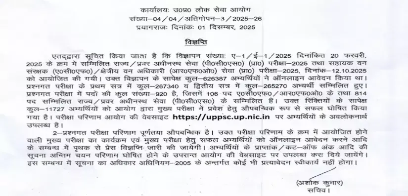 UPPSC PCS 2025 Result: The Uttar Pradesh Public Service Commission (UPPSC) has released the Provincial Civil Services (PCS) Result 2025. Candidates who appeared for the UPPSC PCS 2025 Preliminary Examination can check the UPPSC PCS 2025 Preliminary Result at the official website- uppsc.up.nic.in. As per the UPPSC PCS 2025 Result announced, 11,727 candidates are provisionally shortlisted for the UPPSC PCS Mains Examination tentatively scheduled for February/March 2026. Candidates can access the direct link here with important instructions.